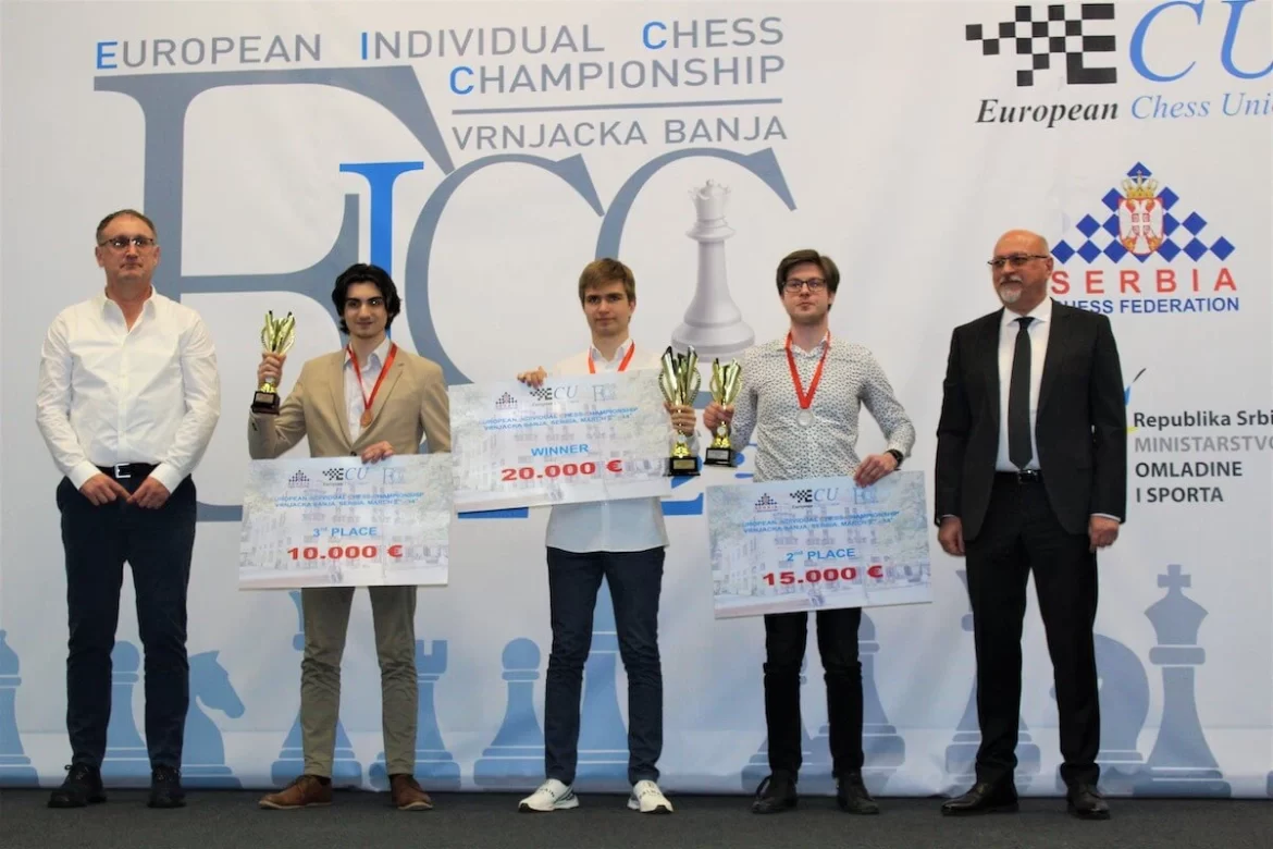 With the best tiebreak criteria, GM Alexey Sarana clinched the title of the Europan Individual Chess Champion 2023, GM Kirill Shevchenko came second, while GM Daniel Dardha won the bronze medal.